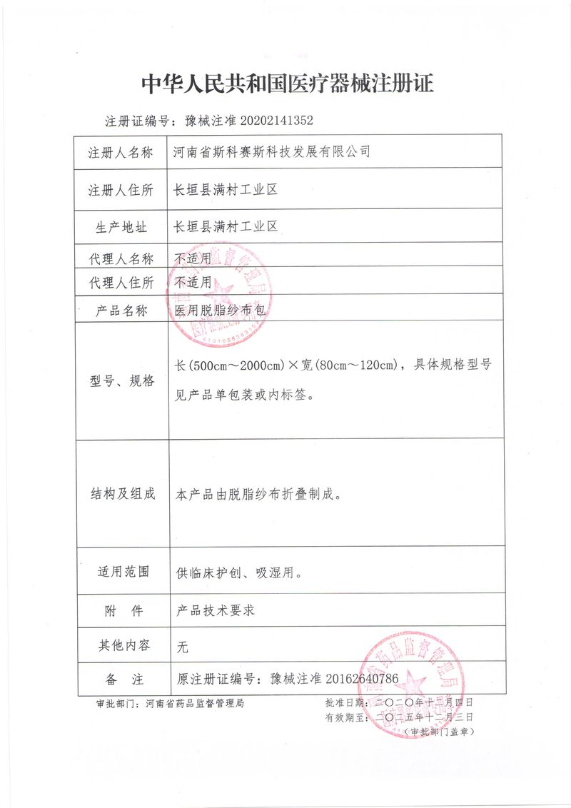 河南省斯科賽斯科技發展有限公司創建于 2011 年,位于“中國醫療耗材之都”- 河南省長垣縣,西臨 308 省道,南靠新菏鐵路,北依長濟高速,交通便捷,經濟發達,環境優美。斯科賽斯積極進入醫療健康和服務領域,秉承為用戶創造價值的理念,專注于醫用耗材解決方案的研發和運營,并為用戶提供完善的產品解決方案;  斯科賽斯主要生產醫用麻醉系列、醫用高分子系列、醫用敷料包系列、醫用無紡布系列、醫用防護系列、醫用脫脂棉系列、生物材料制品類等七大類、100 多個品種、400 多個規格的產品。公司占地面積約 30000 平方米,建筑面積20000 平方米,擁有 10 萬級的凈化車間總面積 10000 平方米。擁有國際先進水平的生產設備和檢測儀器,技術裝備精良,檢測手段完善,為醫療行業的不斷發展進步提供保障。公司順利通過 ISO9001、ISO13485 質量管理體系認證。  斯科賽斯堅持研發高科技新產品,力爭在醫療器械關鍵領域取得技術和研發的重大突破;立足國內和國際兩個市場,逐步實現管理理念、經營機制、人力資源、技術、產品、市場等全方位對接,提高企業的核心競爭力;過去的歲月里,斯科賽斯砥礪前行,誠信務實,銳意進取,不斷創新,用自己的睿智和辛勞,以富有責任感的使命,在探索中追求,在追求中超越,致力于成為值得信賴的醫療用品生產企業!在未來的日子里,斯科賽斯將一如既往豪情滿懷,信心百倍,攜手并肩,執著追求,向更高的的目標前進,鑄造新的輝煌!